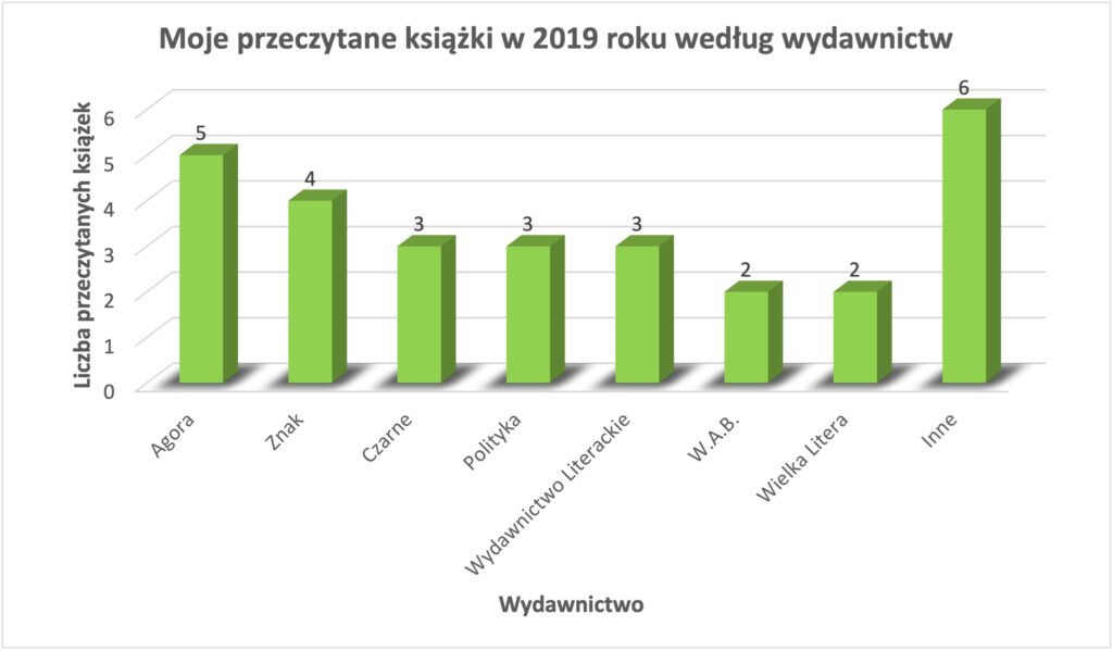 Do kategorii „Inne” należą wydawnictwa, które przeczytałem po jednej książce: Świat Książki, WAM, Czytelnik, Albatros, Muza, Stowarzyszenie Centrum Badań nad Zagładą Żydów