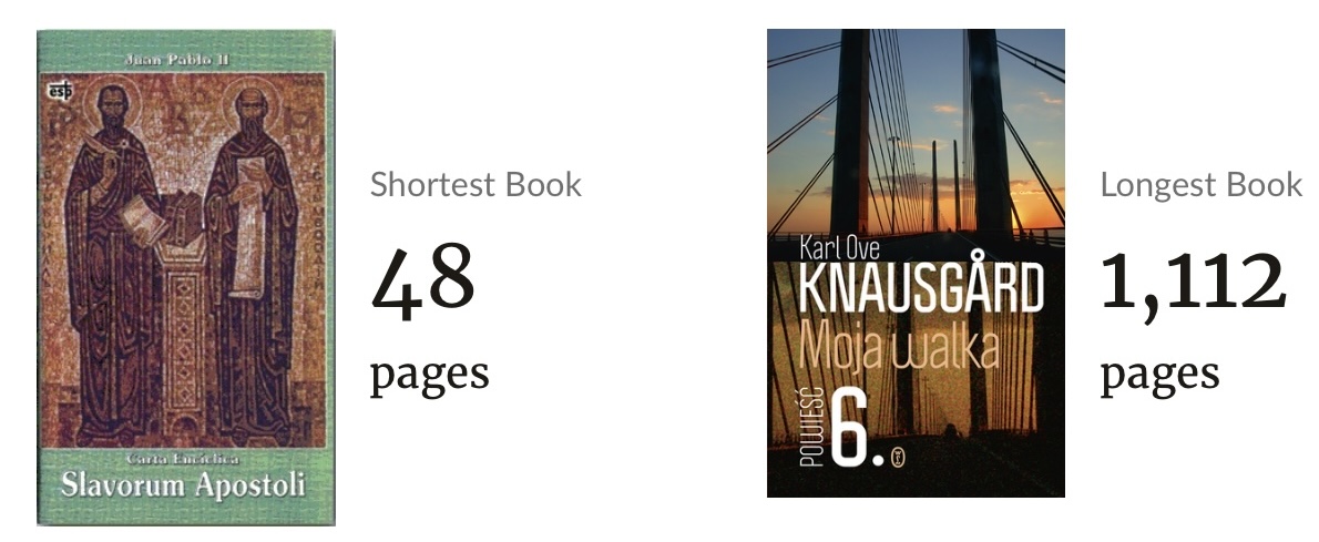 Najgrubszą pozycją był ostatni tom „Mojej walki” Karla Ove Knausgårda liczący 1112 stron. Dla równowagi najcieńszą objętościowo okazała się Encyklika Jana Pawła II „Slavorum Apostoli” z 48 stronami.